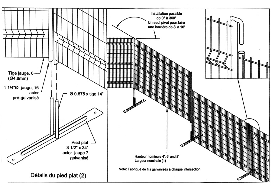 Clôtures temporaires pour protéger les chantiers de construction, les activités de foules (spectacles, foires, festivals) et plus encore. Elles sont fabriquées de fil de calibre 6 soudé et embossé pour leur donner plus de résistance.